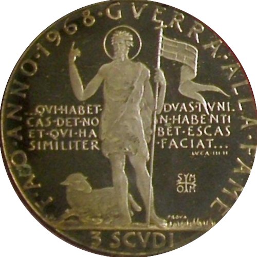 At first glance, this appears to be well preserved Order of Malta 3 Scudi with deep mirror proof surfaces. This by itself is suspicious, as it isn’t consistent with all of the other known specimens I’ve examined of this coin which is now 40 years old. On comparison with a genuine coin, this piece shows inferior striking that would be expected from a transfer die ( see above ). It is definitely does not show the superior strike that would be expected with a gem proof. This should be considered the tip of the iceberg. All coins from the same source should be considered suspect. In particular, medium priced modern coins ($20-$100) from the source should be considered to be counterfeit until proven otherwise. This could show up as one or more coins substituted in an album or board. Likely targets of these forgers would be the 1972 (or 1973!) 50 Won coin from Korea, offered either individually, or substituted into Tan Board 3, or Blue Book 2, and all of the $4 ECCA Coins. I would consider the above example to be a relatively "good" fake. The "Sealand" example below is a TERRIBLE fake.